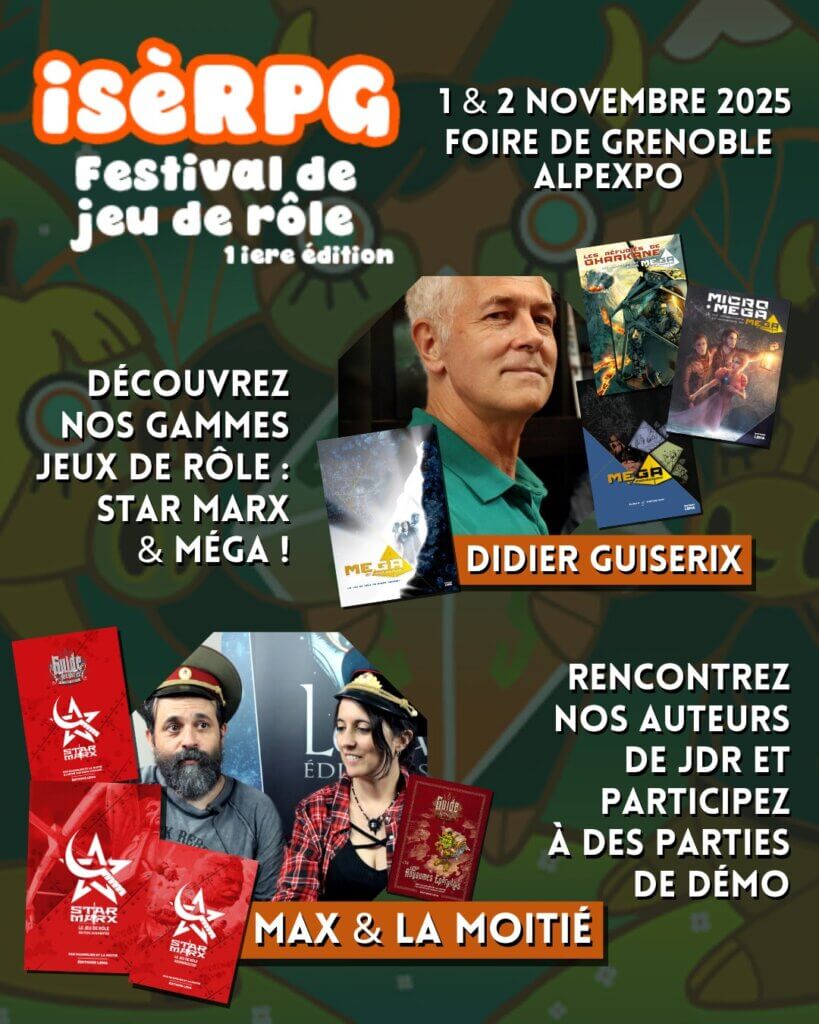 Du beau monde au festival IsèRPG ces 01 et 02 novembre 2025 au stand Léha Éditions: Didier Guisérix pour vous faire jouer à Méga, Max et La Moitié pour jouer à Star MArx ou leur dernière création nanesque…