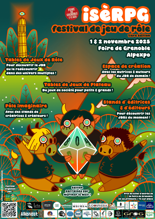 Les 01 et 02 novembre 2025 a lieu la IseRPG à la Foire de Grenoble (AlpExpo) et de nombreux éditeurs rôlistes (et ami(e)s) ont répondu présents pour cette première édition, dont je suis le parrain : Odonata éditions, Par Monts & Dragons, Léha éditions, Monolith, ElderCraft, Chemerarium, Sethmes, Aether-Labs, Alkonost, Léviathan Éditions, Fair Play Éditions, Ludo Spherik,… ! Avec le soutien des boutiques historiques grenobloises de l’imaginaire et du jeu que sont la librairie O’Merveilles et la boutique Les Contrées du Jeu :O <3